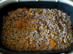 Добавить фарш и натертую на крупной терке морковь, перемешать