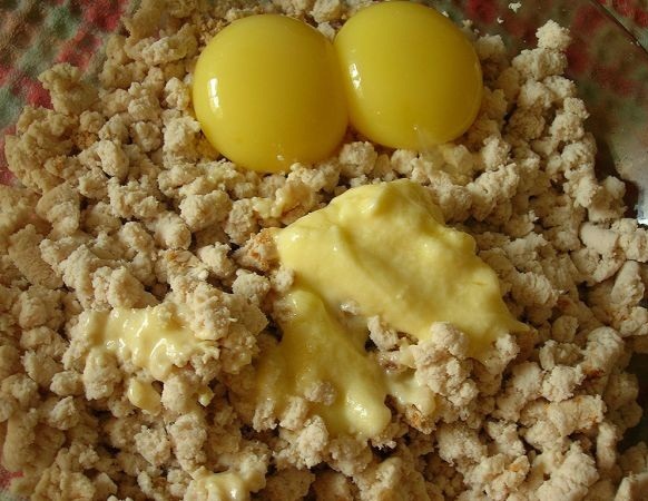 Белки отделить от желтков. В фарш добавляем желтки и сливочное масло. Перемешиваем.