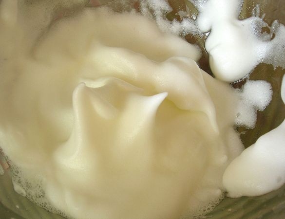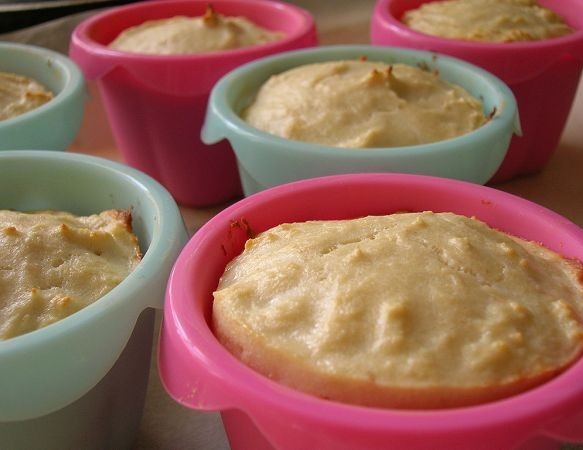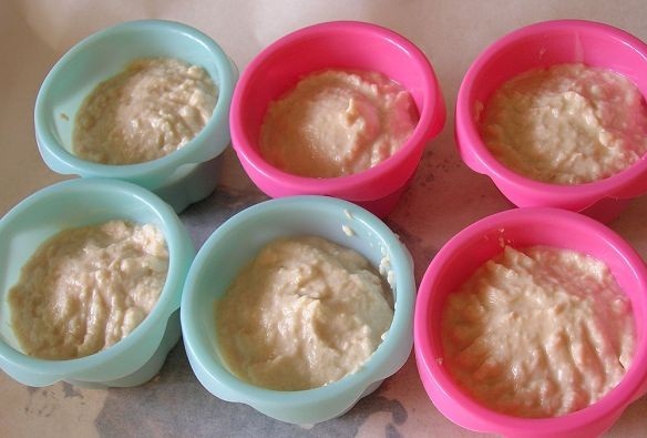 Вводим в блюдо белки. Формочки смазываем маслом и раскладываем нашу смесь( формочки наполняем не до конца).