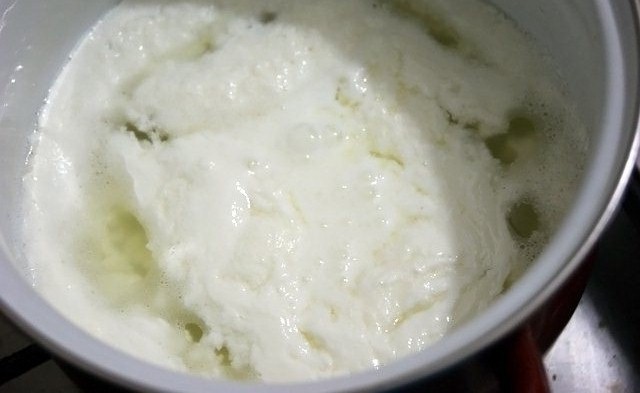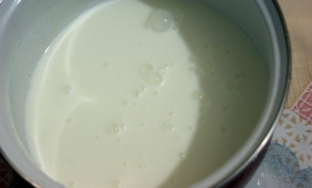 Возьмите 250 мл кефира, вылейте его в эмалированную кастрюльку, поставьте на медленный огонь