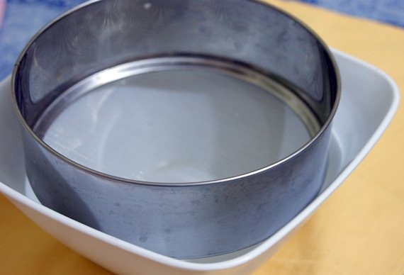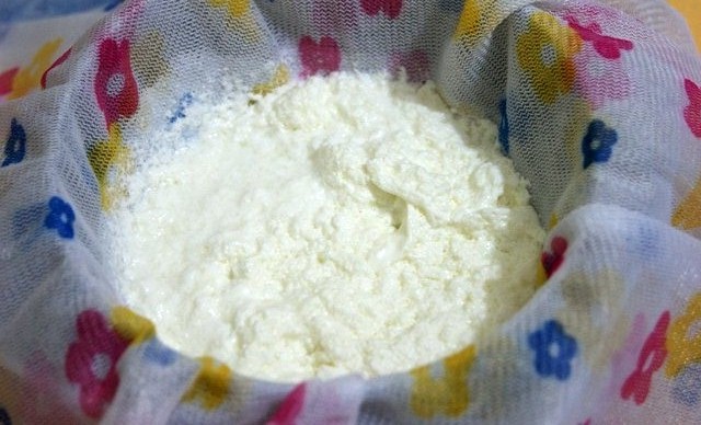 На тарелку положим марлю, сложенную в несколько раз.Вылили все с кастрюльки на эту марлю-немарлю. Отжали