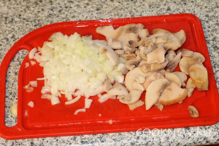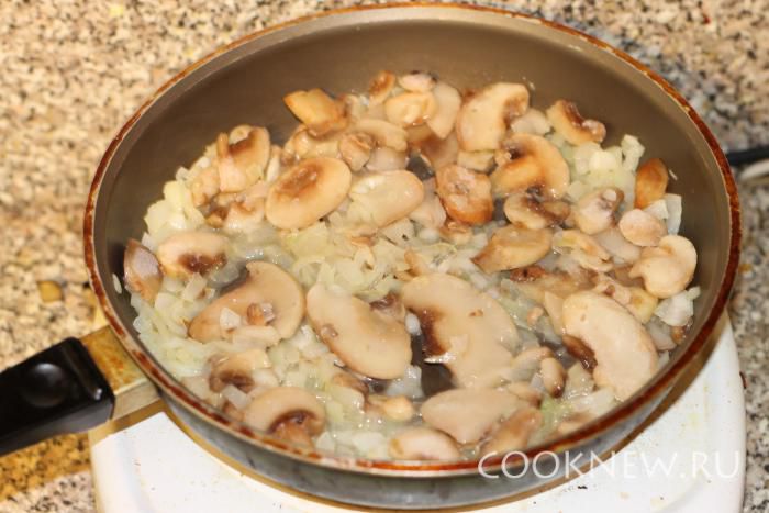 Лук нарезать мелко. Грибы нарезать соломкой. На сливочном масле обжарить лук до прозрачности около 5 минут. Затем добавить гибы, обжарить еще 3 минуты.