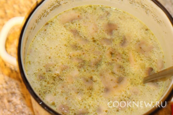 После чего добавить грибы с луком. Все хорошо перемешать. Варить еще 5 минут.