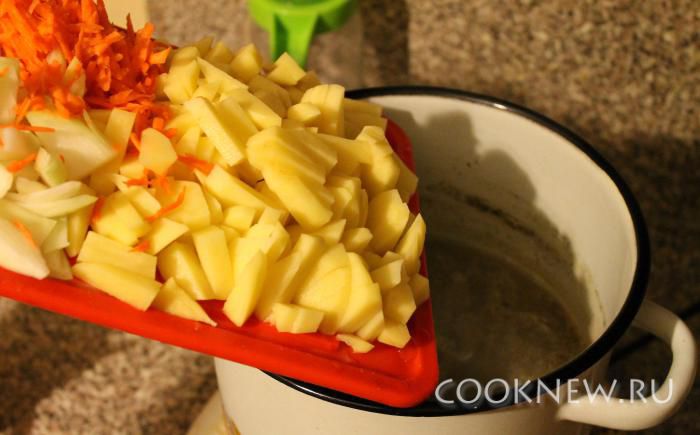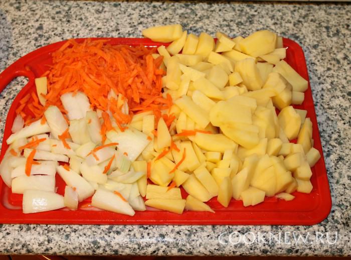 Морковь(одну среднего размера) натрите на терке, покрошите одну луковицу, почистите и порежьте картофель(4-5 картофелин среднего размера) кубиками или брусочками.Затем порежьте мясо маленькими кусочками, можно также поломать его руками(если вы используете голени то предварительно отделите мясо от кости).