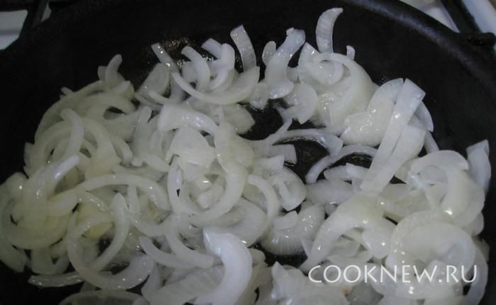 Репчатый лук нарежьте тонкими полукольцами, стебель сельдерея поперечными ломтиками.Обжарьте овощи до прозрачности лука на большой сковороде, помешивая.