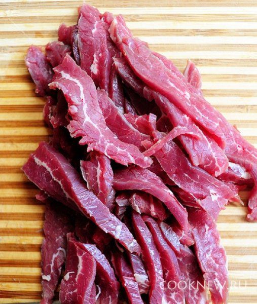 Мясо очистите от пленок,нарежьте соломкой поперек волокон
