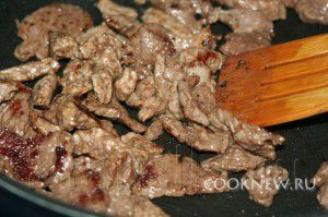 Положите мясо в сковороду, жарьте на большом огне, часто помешивая, пока мясо не потеряет красный оттенок