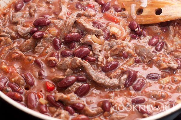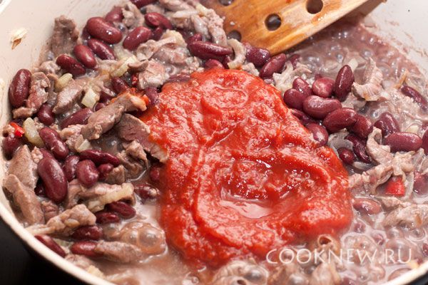 Добавить фасоль и томатную пасту