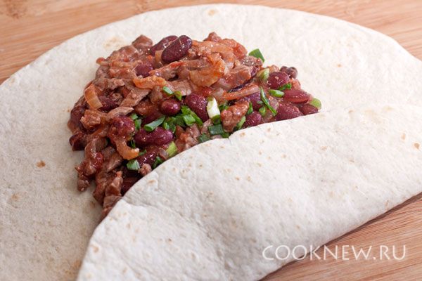 Тортильи подогрейте на сухой сковороде с обеих сторон (или подержите полминуты в микроволновой печи), чтобы они стали мягкими. В каждую тортилью положите половину начинки и заверните лепёшку с трёх сторон наподобие кулёчка, чтобы один край остался открытым. Оберните нижнюю часть фольгой, чтобы удобнее было держать и буррито не разворачивался.
