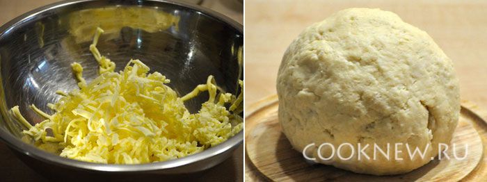 Для теста нужно натереть на терке масло, добавить сметану и муку, заранее смешанную с разрыхлителем и солью, и хорошо вымесить, до однородности. Муку добавляем в два приема, сначала один стакан, и замешиваем ложкой, потом второй стакан, и уже вымешиваем руками. Получается мягкое тесто, почти не липнущее к рукам. Вы можете добавить муки, если тесто прилипает или слишком жидкое, но немного. Скатываем тесто в шар и убираю минут на 20 в холодильник или другое холодное место.