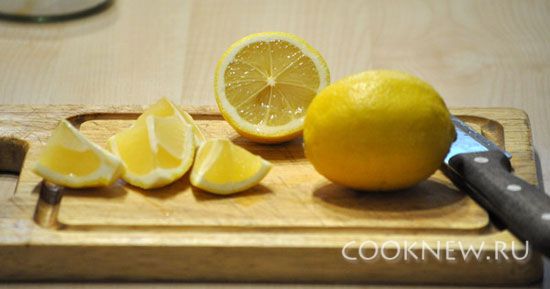 В это время готовим начинку. Два больших лимона или три поменьше нужно хорошо вымыть щеткой и окатить кипятком – они понадобятся вместе с кожурой. Режем на кусочки и выбираю все косточки.