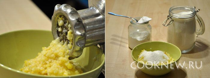 Затем лимоны нужно прокрутить в мясорубке. Добавляем к лимонам сахар и крахмал, хорошо размешиваем – начинка готова.
