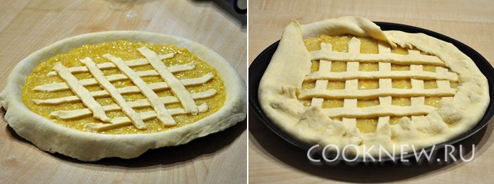 Выкладываем тесто в форму, выливаем и разравниваем начинку, сверху крест-накрест кладем полоски теста и заворачиваем свободные края теста на пирог, слегка защипывая. Все, отправляйте в духовку на 30-40 мнут. Верх должен зарумяниться, начинка будет казаться жидковатой – она станет плотнее, когда пирог остынет.