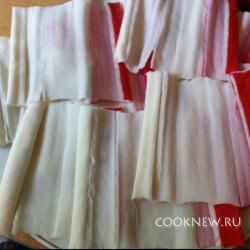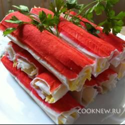 Крабовые палочки хорошо разморозить, помять с боков и аккуратно развернуть