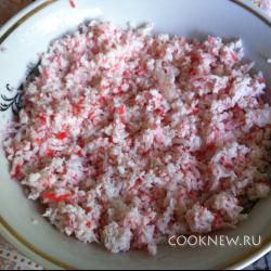 Крабовые палочки натереть на мелкой терке. Разделить полученную крабовую крошку на 2 части, одну положить в салатницу, в другой части обвалять шарики.