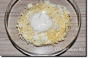 Добавить майонез и чеснок, натертый на терке. Все хорошо перемешать.