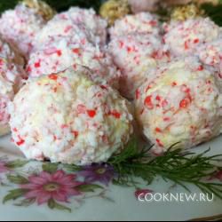Салат с сыром, яйцом и крабовыми палочками, оформленный в виде шариков рафаэлло, очень просто и вкусно