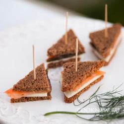 Смазать кусочки хлеба маслом. Затем положить маленький кусочек сыра, семгу, снова сыр и накрыть вторым кусочком хлеба. Сколоть зубочисткой и убрать в холодильник.