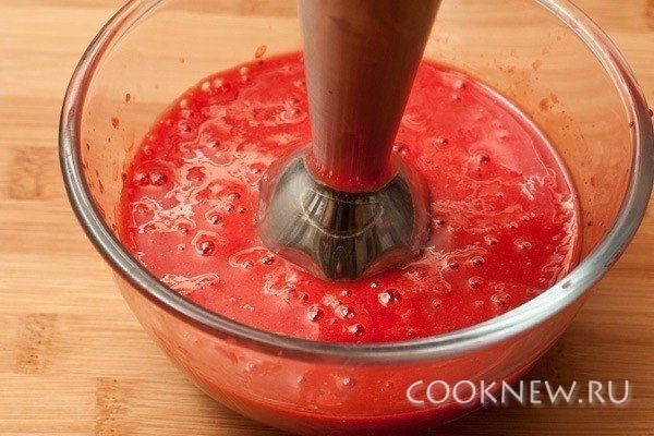 Разморозьте клубнику. Сок сохраните. Превратите ягоды в однородное пюре с помощью блендера
