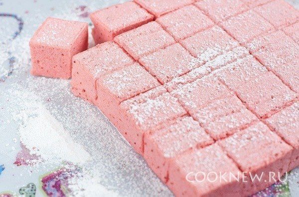 Когда масса застынет, переверните форму на присыпанную сахарной пудрой поверхность и удалите бумагу. Нарежьте кубиками, обваляйте в сахарной пудре и подавайте.