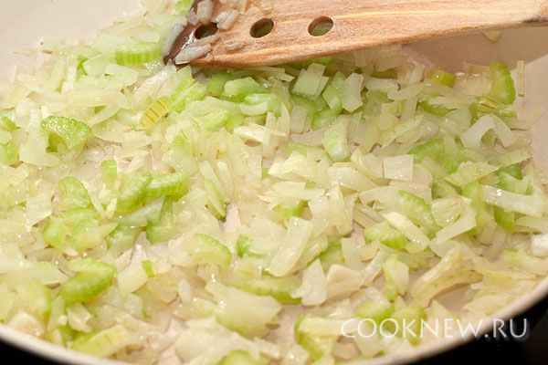 Мелко нарежьте репчатый лук и стебли сельдерея, обжарьте их до прозрачности в небольшом количестве масла. Готовьте на маленьком огне, помешивая