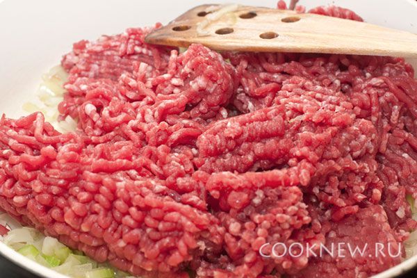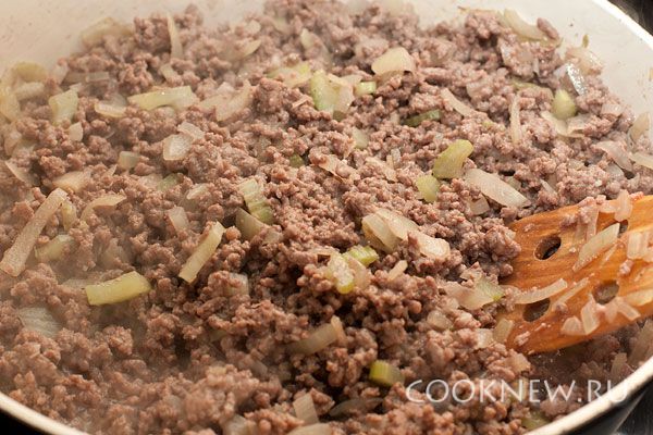 Жарьте всё вместе, помешивая и разбивая лопаточкой слипшийся фарш. Посолите и поперчите по вкусу, уберите готовый фарш с огня и остудите