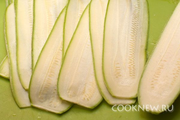 Молодые кабачки нарежьте вдоль очень тонкими полосками с помощью ножа для чистки овощей или ножа для шинковки. Должны получиться полоски толщиной около миллиметра