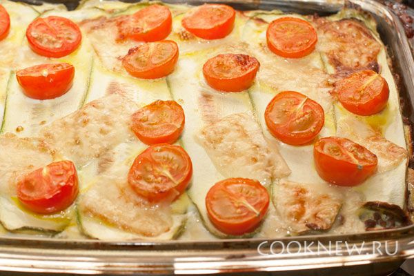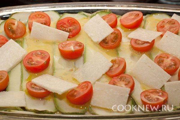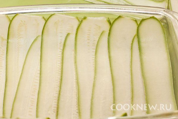 Форму для запекания (лучше прямоугольную) выстелите полосками кабачка в один слой. Антипригарную форму смазывать маслом не нужно