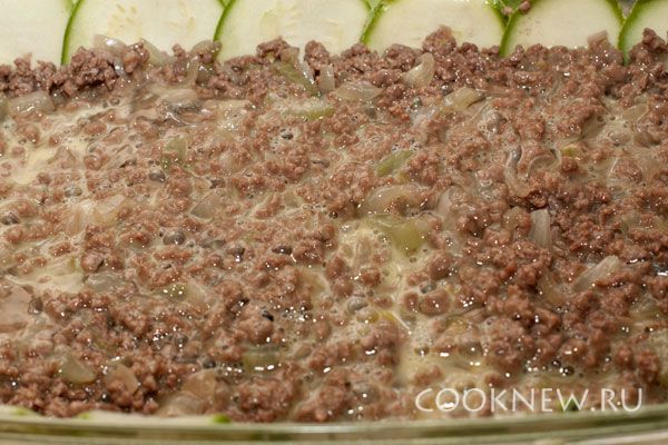 Слегка взбейте в отдельной миске яйца, отложите немного для смазки верха запеканки. Остывший (не горячий) фарш смешайте с яйцами и положите половину смеси на слой кабачков. Если хотите сделать больше слоев, то выкладывайте меньшее количество фарша. На фарш снова уложите слой кабачков, затем слой фарша и опять слой кабачков. В моем варианте три слоя кабачков и 2 слоя фарша. Главное, чтобы снизу и сверху были кабачки