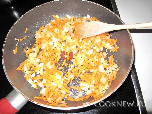 Лук мелко порезать, морковь натереть на крупной терке. Пассеровать овощи с растительным маслом