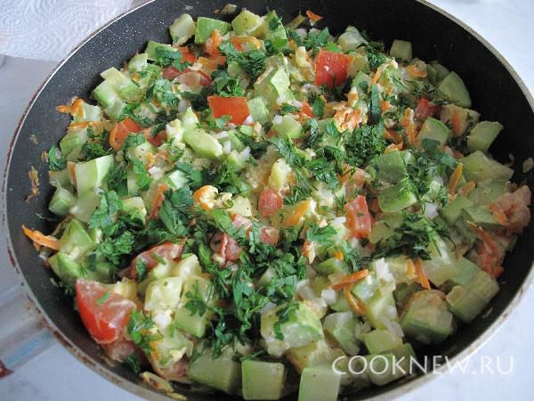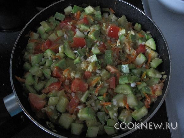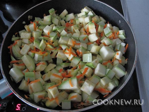 Кабачки порезать кубиками и добавить к луку с морковью. Тушить до полуготовности,где-то 5 мин