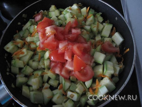 Помидоры порезать и добавить к овощам, тушить до готовности кабачков (примерно 5 минут)