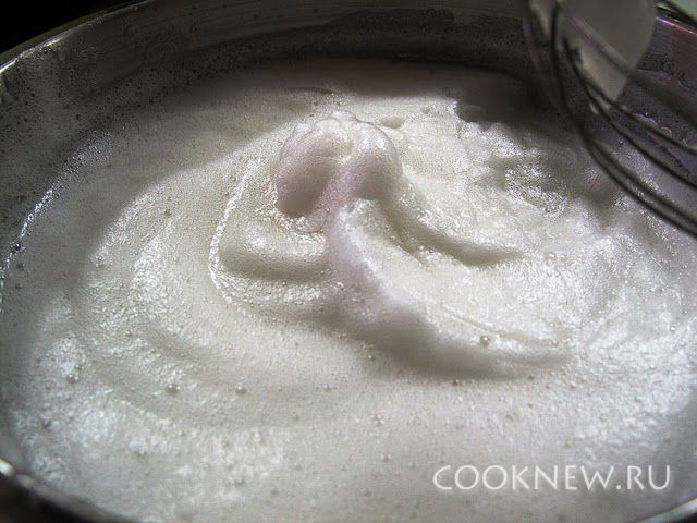 Белки взбейте с щепоткой соли до крутой, но не блестящей пены. Пена должна оставлять мягкие, не крутые пики.