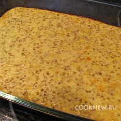 Осторожно вмешайте белки в гречку с творогом.Распределите массу на дне подготовленной формы. Разровняйте верх и выпекайте 30 минут при 200 С, пока верх не подрумянится. Дайте остыть, прежде чем разрезать на квадратики.