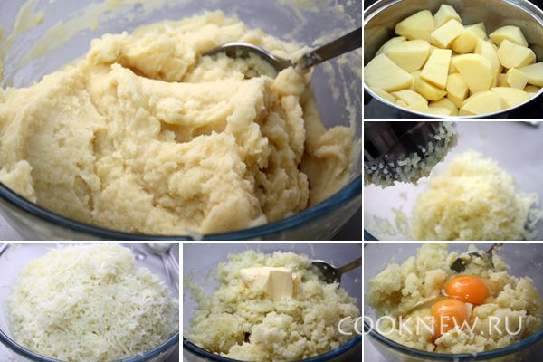 Картошку очистить и сварить в подсоленной воде, затем сделать из нее пюре, в которое добавить масло и яйца. Все перемешать до однородности