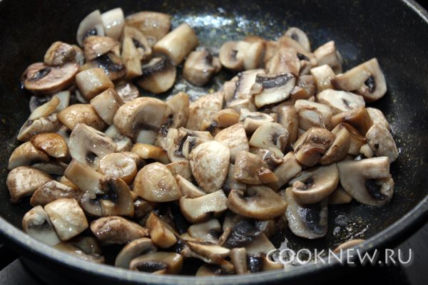 Обжарить шампиньоны, нарезанные небольшими кусочками