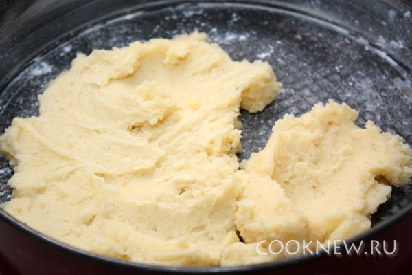 Форму для запекания смазать маслом и посыпать мукой. Половину пюре выложить ровным слоем в форму