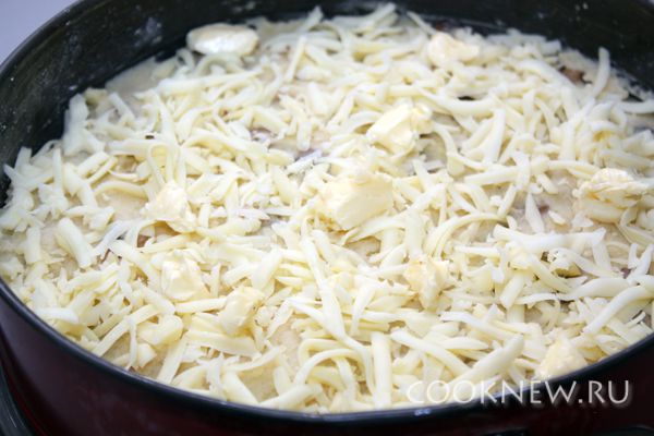 На грибную начинку положить оставшуюся картошку, посыпать тертым сыром и положить небольшие кусочки масла