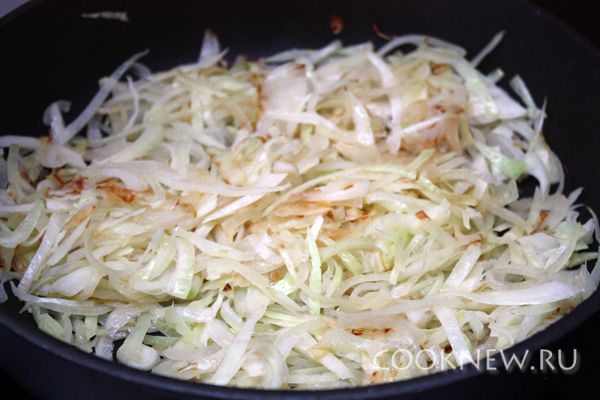 Нарезать большую луковицу тонкими полукольцами, тонко нашинковать капусту. Все вместе обжарить в небольшом количестве растительного масла до легкого золотистого цвета
