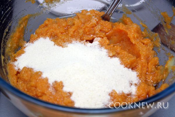 Тыкву с картошкой размять в пюре, добавить 2-3 столовые ложки растительного масла и манную крупу, посолить. Хорошо перемешать до однородности