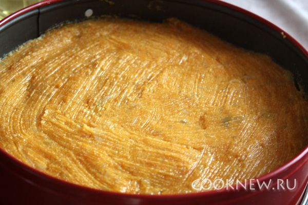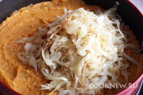 Дно разъемной формы смазать маслом, посыпать манной крупой или сухарями. Половину овощного пюре выложить ровным слоем на дно формы. Сверху положить луково-капустную начинку