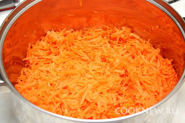 Морковь отчистить, натереть на крупной терке, положить в кастрюлю и залить водой, чтобы она едва-едва покрывала морковь. И поставить на медленный огонь