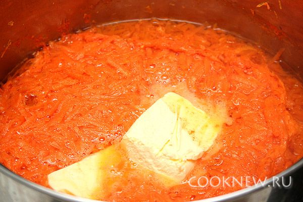 На медленном огне довести до кипения, после чего добавить масло, посолить и всыпать сахар. Варить на небольшом огне до готовности моркови, около 30 минут. После чего слить лишнюю воду и остудить морковь