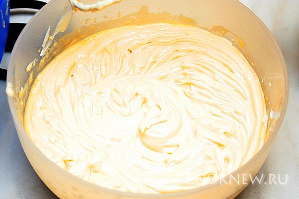 Отделить белки от желтков. Желтки взбить и соединить с перетертым творогом, перемешать