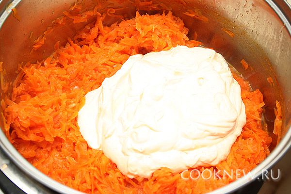 Перемешать яично-творожную смесь с морковью. Добавить муки и тщательно перемешать