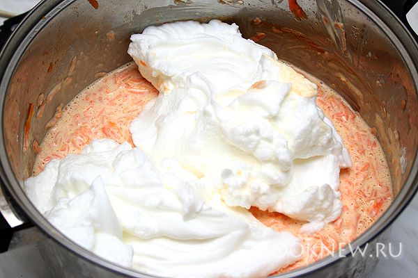 Аккуратно перемешать получившуюся массу со взбитыми белками