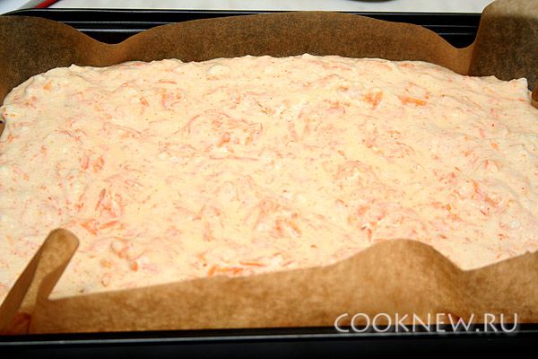 Форму проложить бумагой для запекания (или смазать маслом и посыпать панировочными сухарями). Выложить творожно-морковную смесь и разровнять. Сверху присыпать панировочными сухарями. Поставить в разогретую до 180 °С духовку и запекать до готовности, примерно 40 минут