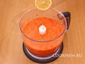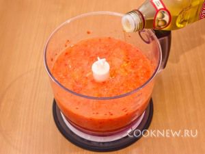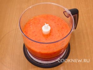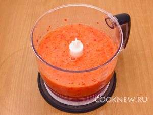 В блендере измельчить помидоры, болгарский перец, огурцы, лук, чеснок.