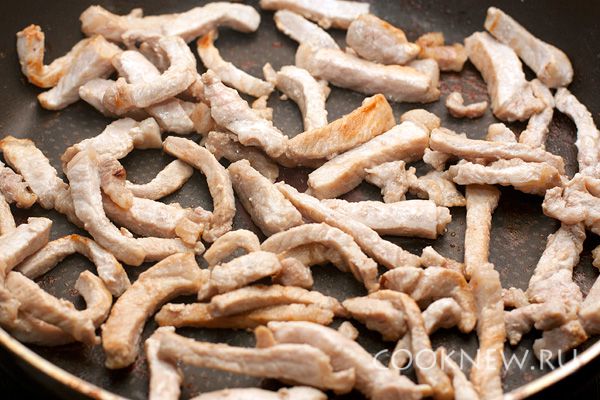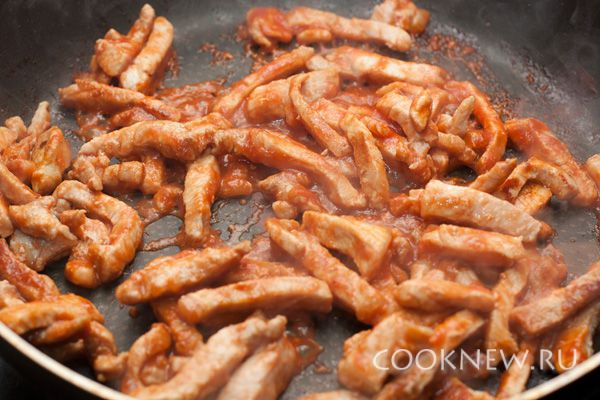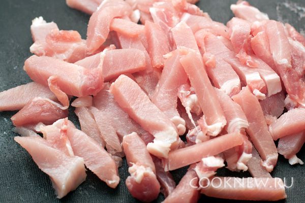 Мясо нарежьте тонкими брусочками