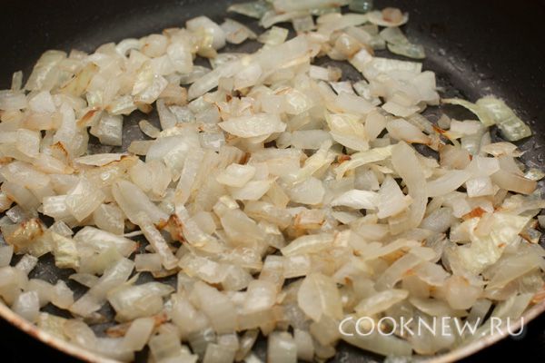 Очистите и нарубите репчатый лук, обжарьте его до легкого золотистого оттенке в небольшом количестве масла. Переложите в миску